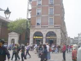 I was surprised at how the area has changed: the Odeon is an ugly black edifice, there's another giant cinema across from it, the Empire, and just off the Square is a large Warner Village cinema. Most of the shops around there seemed to be various fairly seedy or naff emporia, such as cafes, pubs, slot arcades or video game parlours - that sort of thing (I don't remember any specifically). On the southern side of the central grassy area is the Half Price Ticket Booth. That part of the Square was redeveloped around 1990/1 as an underground power substation.